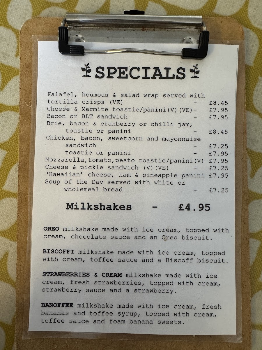 Start your experience here with one of their expertly crafted milkshakes—imagine the rich flavors of Oreo, Biscoffi, Strawberries & Cream, and Banoffee that can cool you off on a hot day. The café boasts an impressive selection of lunch options. Whether you fancy a hearty wrap filled with falafel and houmous served with crispy tortilla chips for £8.45 or a tempting Brie, Bacon & Cranberry toastie for £8.45, there's something to satisfy everyone’s palate.